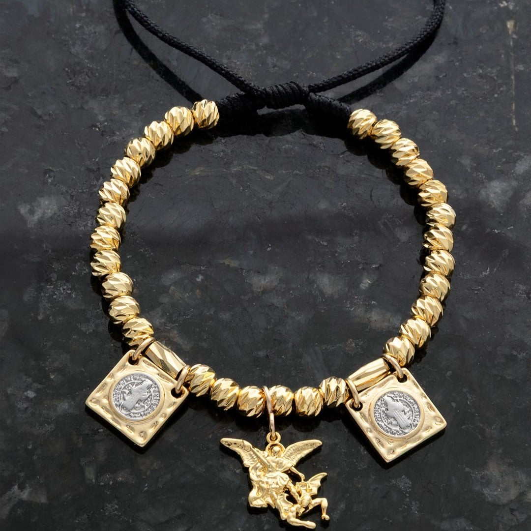 Manilla con balines diamantados Americanos con escapularios San Benito y Dije Silueta San Miguel y canutillos italianos